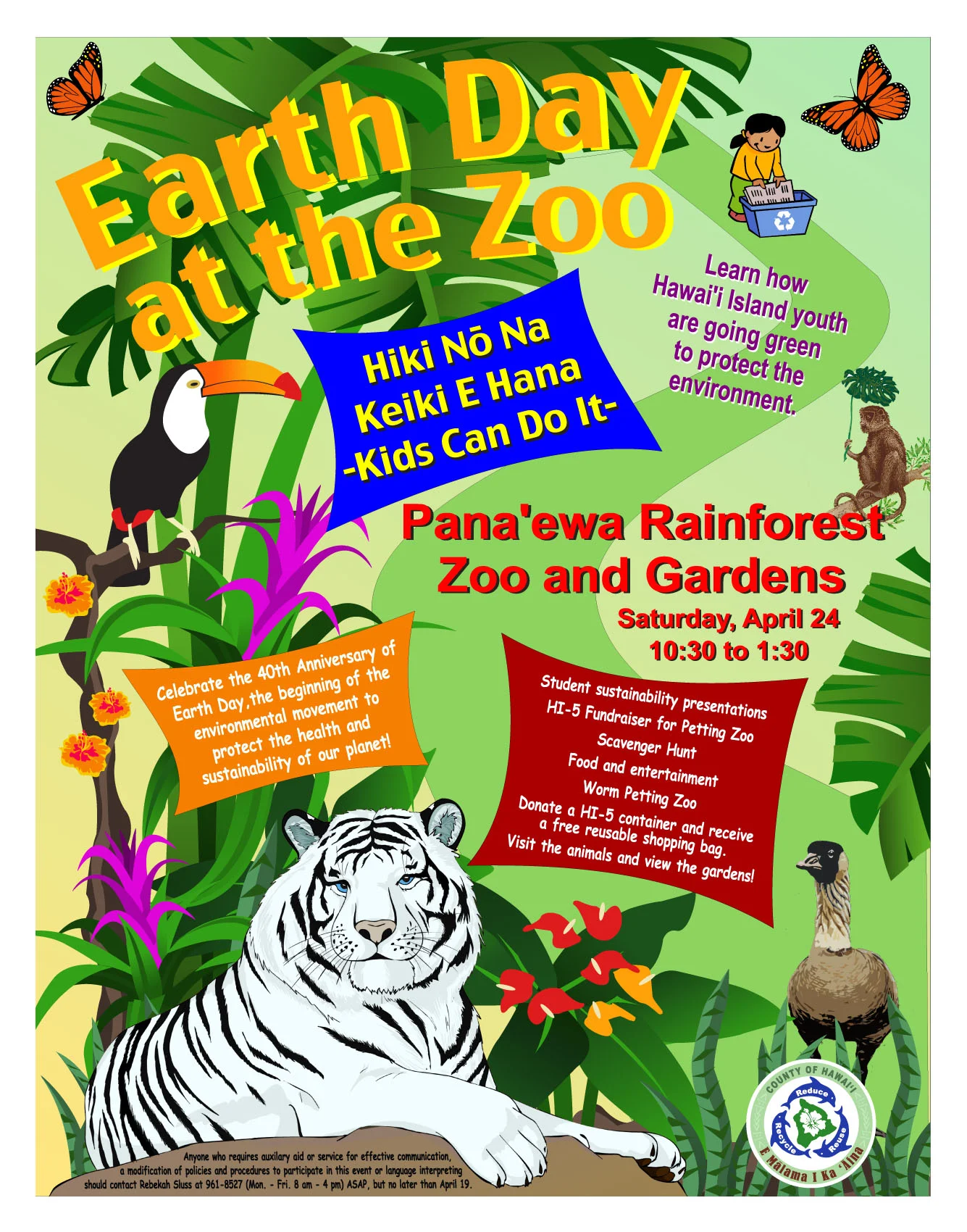 This poster was part of a multi-media campaign to encourage attendance for the celebration of Earth Day at the Pana’ewa Rainforest Zoo. All services provided by Out of the Sea. Images gathered from local artists and clip art libraries. Out of the Sea coordinated poster printing.